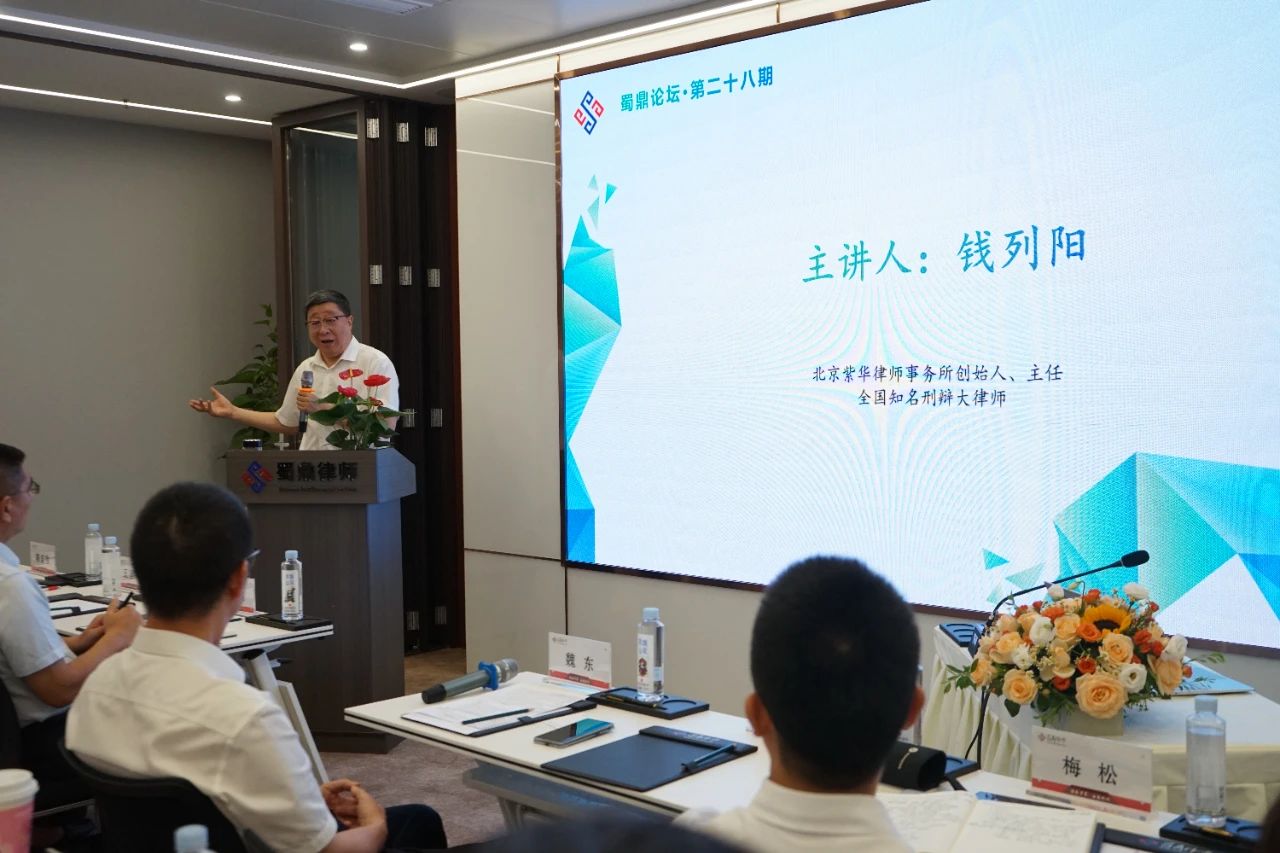 2025年8月11日上午,“蜀鼎论坛”第28期在四川蜀鼎律师事务所北区多功能厅成功举办。本期论坛特邀北京紫华律师事务所创始人、主任、全国知名刑辩大律师钱列阳先生担任主讲嘉宾,四川蜀鼎律师事务所名誉主任、四川大学法学院博士生导师魏东教授担任主持人。来自北京紫华律师事务所、四川蜀鼎律师事务所、四川明炬律师事务所、四川致高律师事务所、北京炜衡(成都)律师事务所、四川国祯律师事务所、四川有同律师事务所,以及北京紫华律师事务所等多家律师事务所的近50名刑辩律师代表参加了本次论坛。