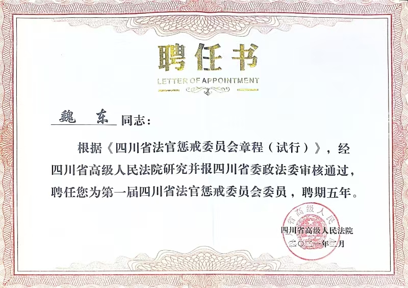 蜀鼎律师魏东教授担任四川省法官惩戒委员会委员