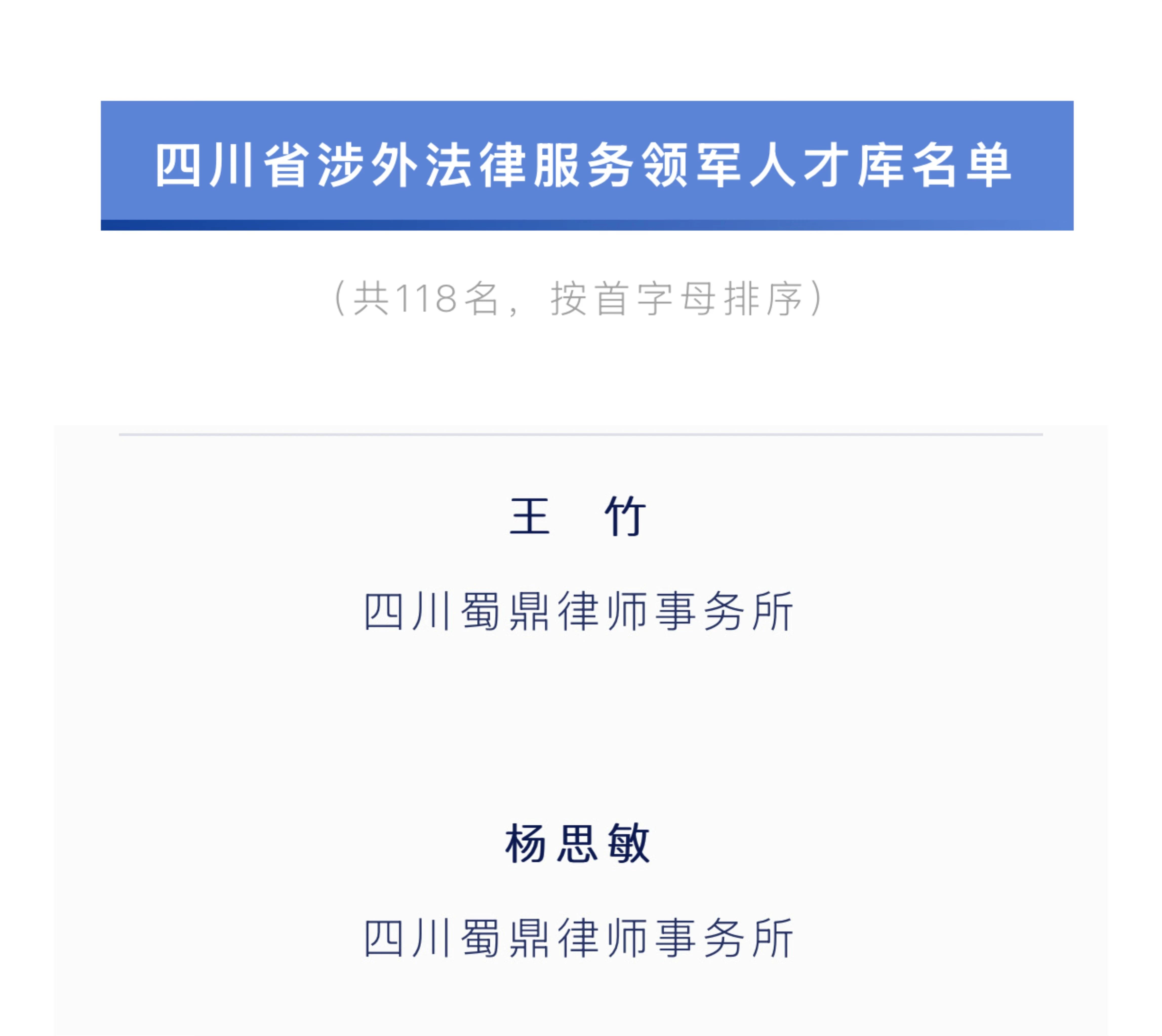 2024年的最后一天,蜀鼎所又传来喜报。四川省律师协会公布了“四川省涉外法律服务领军人才库名单”,蜀鼎所王竹教授、杨思敏律师成功入选。