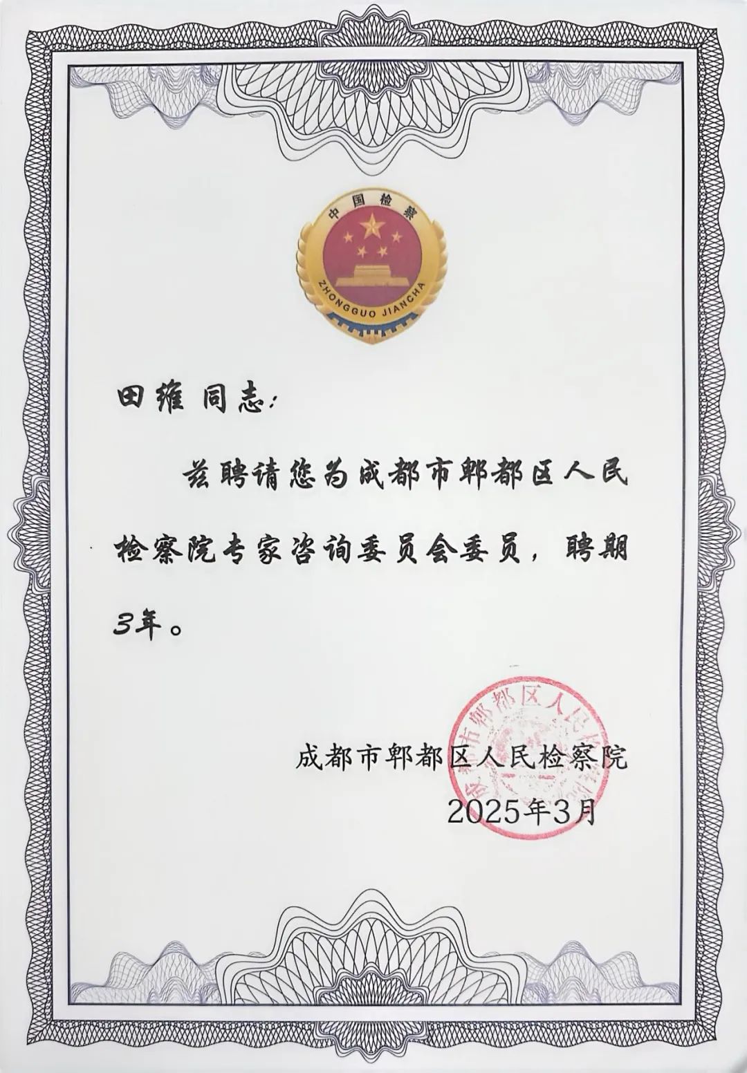 2025年3月20日上午,成都市郫都区人民检察院召开了“抓实“三个管理” 共谋创新发展”座谈会暨“专家咨询委员聘任仪式”,座谈会及聘任仪式由成都市郫都区人民检察院贾颖检察长主持,郫都区人民检察院的全体领导班子成员、业务部门负责人及干警代表,以及来自四川大学、四川师范大学、西南石油大学,西华大学、成都工业学院等高校的多名专家学者,出席了本次活动。蜀鼎所名誉主任、高级律师,四川大学法学院教授、博士生导师魏东教授,蜀鼎所专家律师、西南石油大学法学院硕士生导师田维博士,应邀参加了座谈会,并被聘为成都市郫都区人民检察院专家咨询委员会委员。