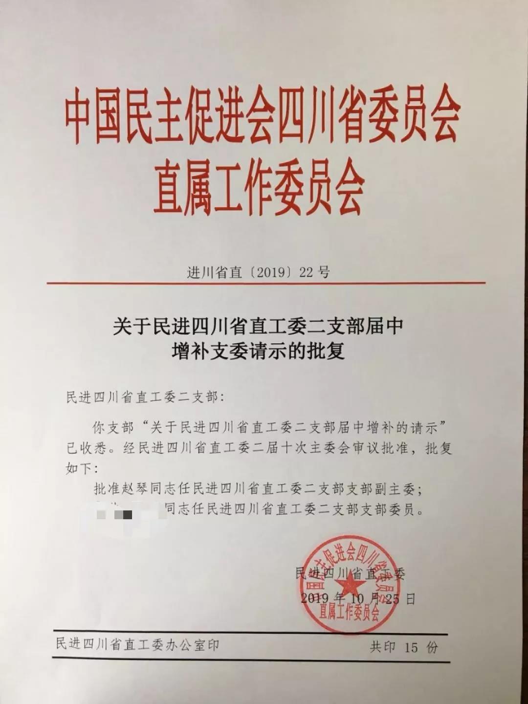2019年10月25日,民进四川省直工委发文批准了我所赵琴律师任民进四川省直工委二支部支部副主委。赵琴律师2019年出任民进四川省直工委二支部支委,负责组织工作。在任内,赵琴律师利用自身专业优势,积极组织、参与民进省直工委各项活动,献言献策,热心服务,获得省直工委领导及各位会员的高度肯定,于2019年初获得“优秀会员 ”称号。本次当选是对赵琴律师以往工作的认可,祝愿赵琴律师在新的职位上取得更大成绩。