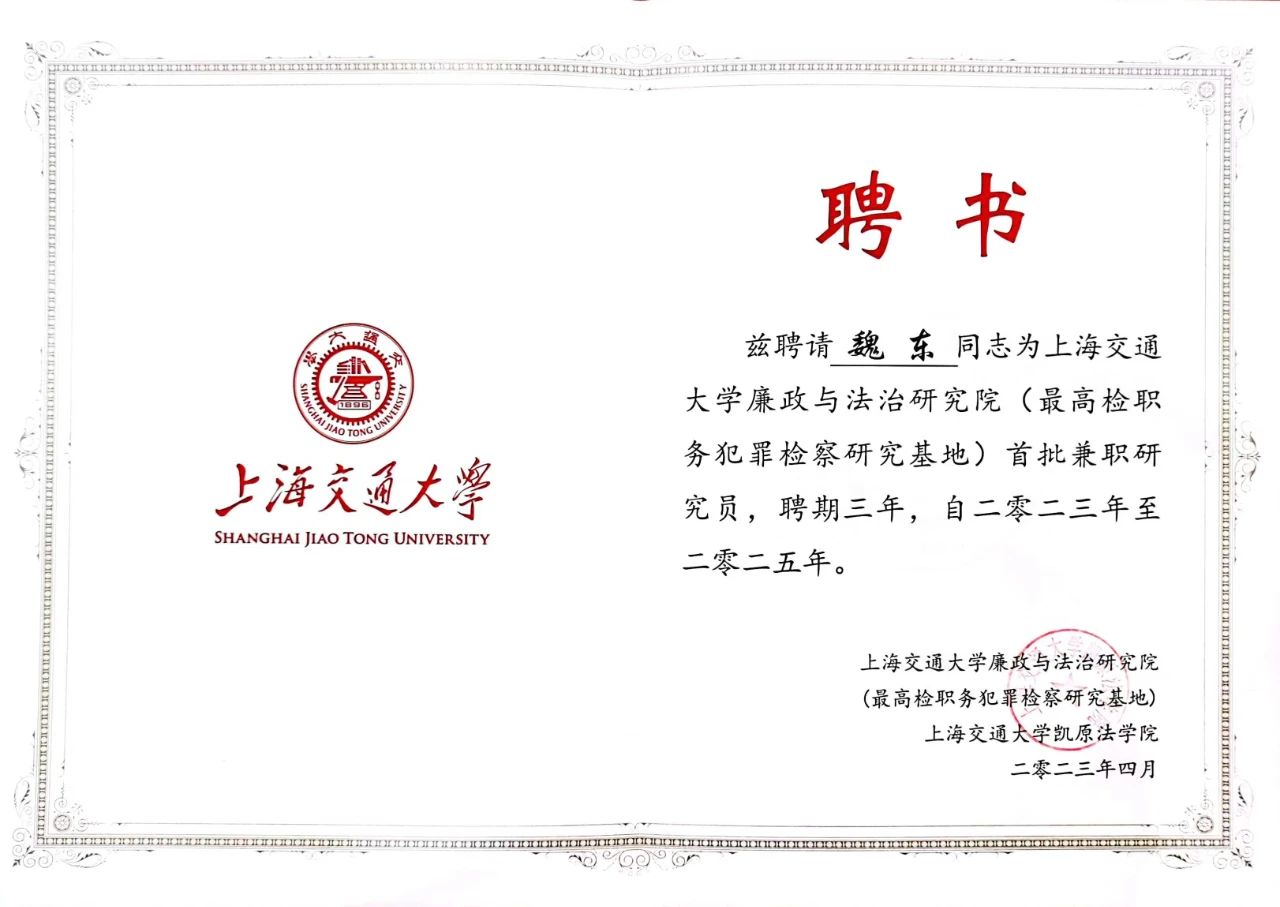2023年4月,蜀鼎刑辩团队专家律师、四川大学法学院博士生导师魏东教授收到聘书,获聘为上海交通大学“廉政与法治研究院(最高检职务犯罪检察研究基地)首批兼职研究员”,这是对魏东教授多年来在法律专业领域所取得的科研成果和实务业绩的充分肯定。