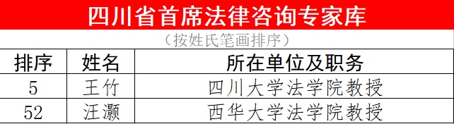我所律师王竹教授、汪灏教授入选四川省首席法律咨询专家库,祝贺两位专家律师入选!