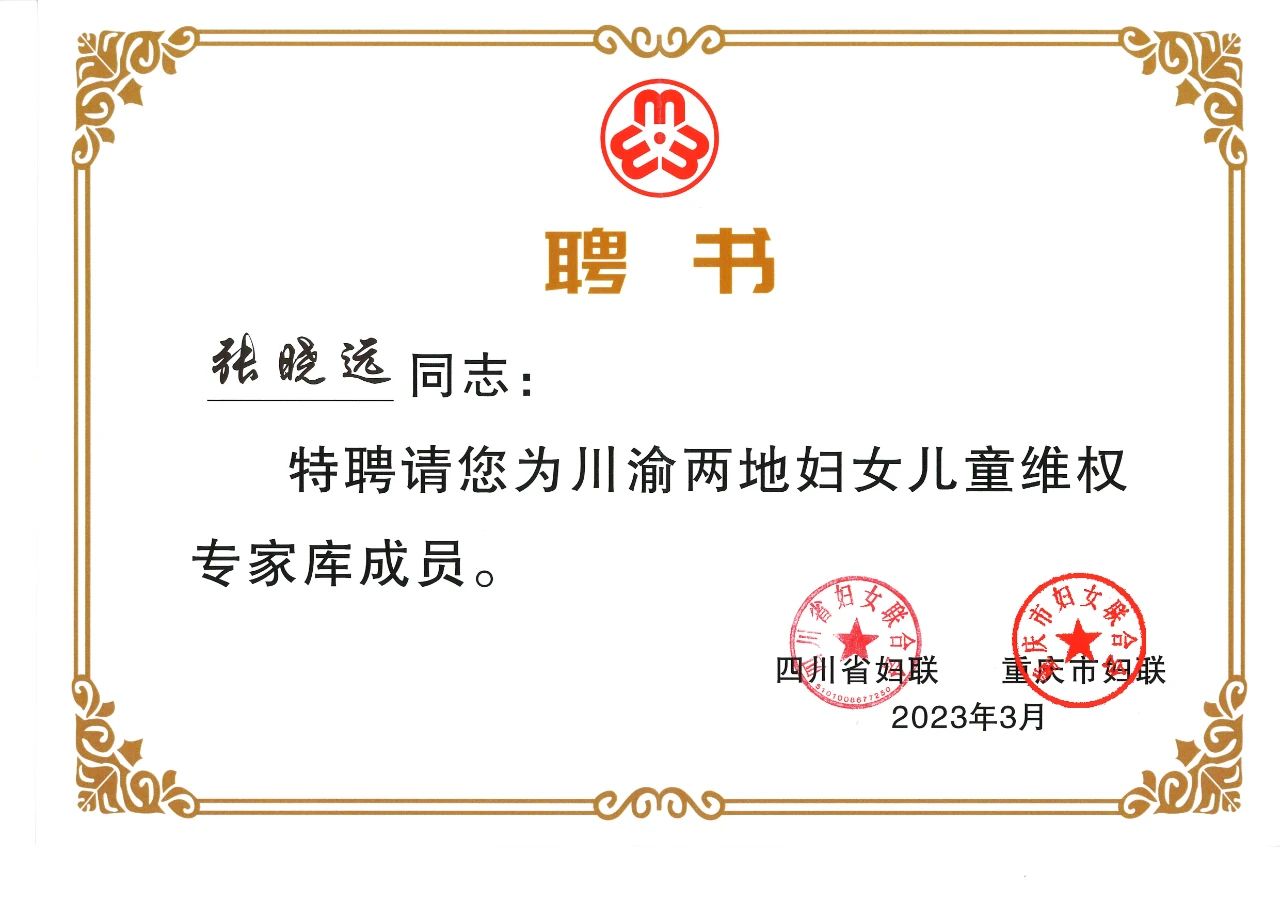 为了开展川渝妇联一体化,进一步推进妇女儿童维权工作,2023年四川省妇联与重庆市妇联签订了《川渝妇联一体化推进妇女儿童维权工作合作协议》,共同启动“川渝妇女儿童维权行动”,川渝两地妇联将从建立毗邻地区联动机制、异地培训交流提能机制、项目合作成果共享机制等方面,持续推动双方全方位宽领域多层次合作,形成联动维权工作格局,全力维护妇女儿童合法权益。为此川渝两地妇联专门组建“川渝两地妇女儿童维权专家库”,邀请川渝两地的妇女儿童维权专家成为专家库成员,并向专家们颁发了聘书。蜀鼎所管委会主任、四川大学法学院副教授张晓远被聘为“川渝两地妇女儿童维权专家库成员”。