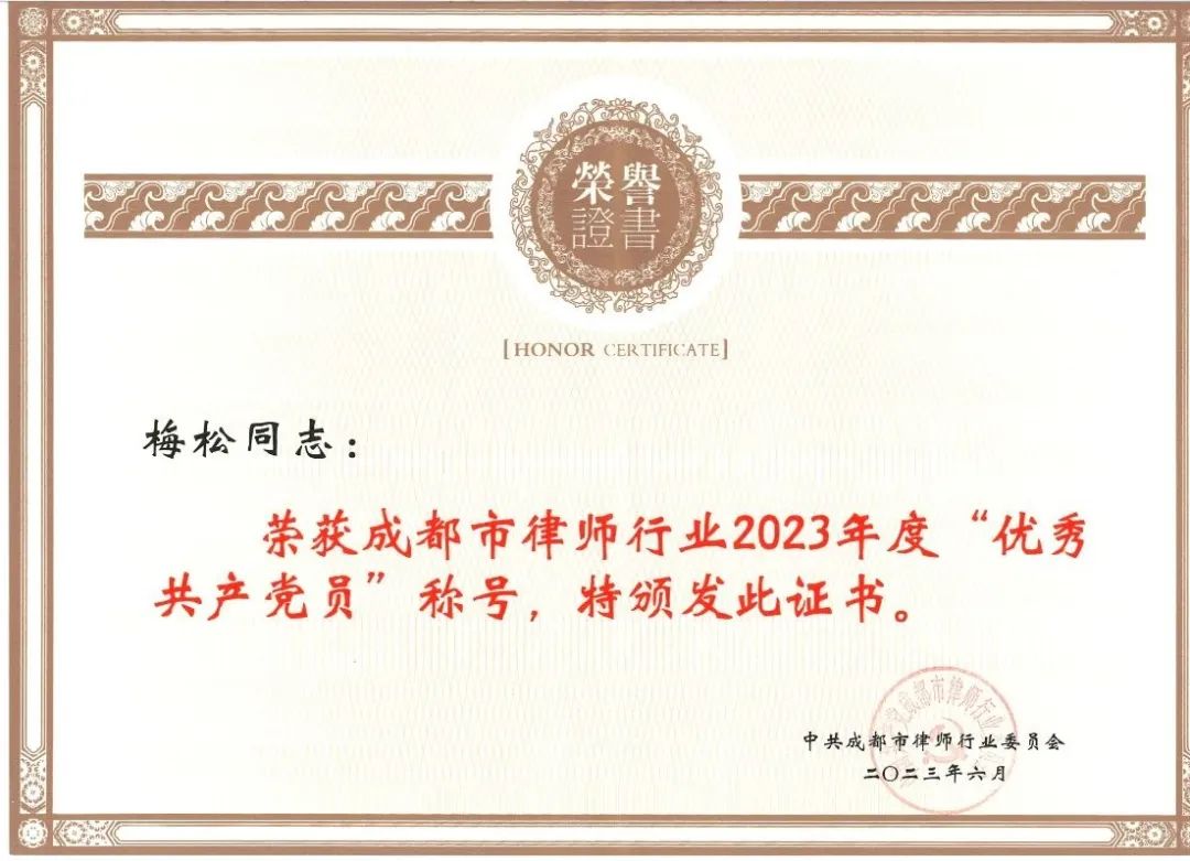 成都市广大青年律师坚持以习近平新时代中国特色社会主义思想为指导,涌现了一批政治素质高、业务能力强、执业形象好、热心公益事业的优秀青年律师。蜀鼎所管委会成员、高级合伙人梅松律师因政治素养过硬、恪守执业操守、专业能力精湛、工作业绩突出,被评为“2021-2022年度成都市优秀青年律师”。