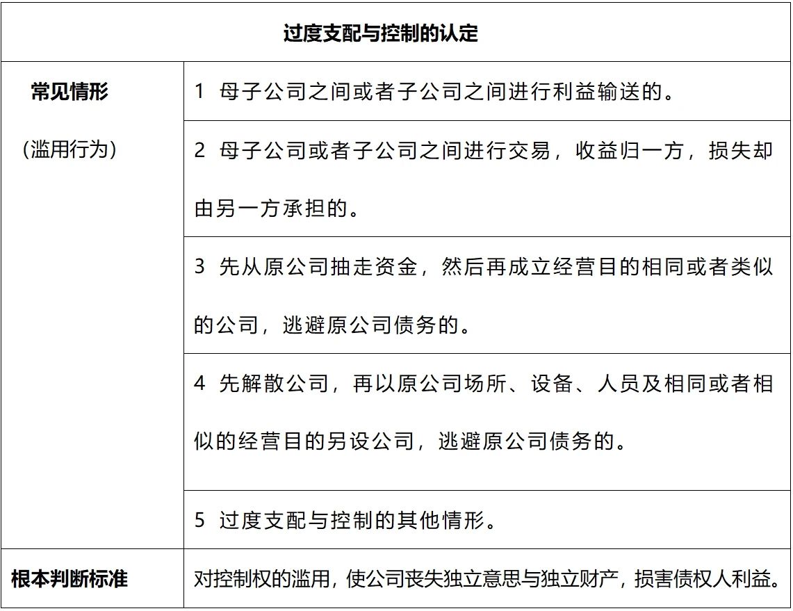 虽上述列举的过度支配与控制情形属于控制股东或实际控制人对公司的操纵行为,属公司人格纵向否认的范围,但基于新《公司法》第23条第2款已将纵向人格否认的范围扩大至横向人格否认,满足上述情形中的关联公司,同样属于纵向人格否认范畴,在此一并进行探究。在(2019)苏民终1528号案件中,法院认为:郭某作为后勤公司控股股东及法定代表人,通过后勤公司投资、控股节能公司,节能公司投资、控股华企公司的方式,实际控制并支配节能公司、华企公司。同时,郭某还是节能公司、华企公司的个人股东,担任两公司高管职位,系三公司的实际控制人。根据债权人提供的华企公司银行流水反映,三公司间存在大量无法说明其真实用途的资金往来。华企公司收入即项目回款或与项目有关的财政补贴被频繁、大额转出给节能公司、后勤公司。节能公司、后勤公司多次向华企公司转入资金,被用于华企公司日常经营支出。据此,法院认为,郭某对公司过度支配与控制,使三公司财产边界不清、财务混同,丧失人格独立性,导致债权人大额债务无法清偿,应对公司债务承担连带责任。同样,在(2019)京03民终2577号案件中,法院认为:“德州锦城公司利用其对子公司的绝对控制权,在短暂持股期间将子公司的重要客户资源以无对价方式转移至自己名下,造成子公司偿债能力下降,进而严重损害子公司债权人债权受偿,该行为已经超过股东对于公司的正常支配与控制范畴。”此类案例完全符合实际控制人控制其关联公司实施利益输送的行为,系过度支配关联公司,同时也符合新《公司法》第23条第2款的公司横向人格否认情形,除股东对公司债务承担连带责任外,各关联公司也应对任一公司的债务承担连带责任。在笔者看来,《九民纪要》虽把“人格混同”与“过度支配与控制“并列为“滥用”行为,但两者在司法实务中却十分相似,往往交叉出现,只是两者的侧重点不同,“人格混同”侧重于体现股东与公司及关联公司之间在“人员”、“财产”、“业务”等外在方面混为一体,而“过度支配与控制”更侧重于股东通过操纵控制权,将个人意志强加于公司使其丧失自我意志及决策,使其公司行为失去合理性,相较于“人格混同”而言其行为更加隐秘。然而从本质上讲,在两种情形下,公司的思想和行动均受股东控制,所体现的均是股东的意志而非公司的意志。
