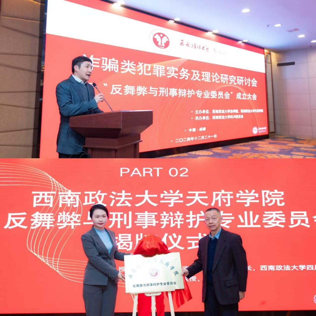 会议一开始,四川大学法学院博士生导师龙宗智教授为西南政法大学天府学院“反舞弊与刑事辩护专业委员会”进行揭牌仪式。揭牌现场掌声四起,礼花缤纷,大家皆为西南政法大学天府学院“反舞弊与刑事辩护专业委员会”的成立感到由衷高兴,并表示热烈祝贺。