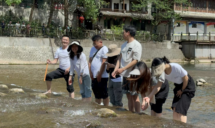 午后,团队转场至“川西水乡”街子古镇。古镇青石板路蜿蜒,明清建筑错落,党员们穿行于茶馆酒肆与百年老宅之间,感受巴蜀文化底蕴。随后部分党员同志在古镇亲水区体验了轻松的水上嬉戏,赤足踏浪、笑语欢声中尽显党支部活力。