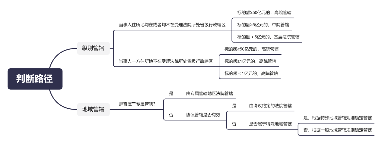 从案件的诉讼标的额,可以判断第一审民商事案件应否由中院乃至高院受理。根据《最高人民法院关于调整地方各级人民法院管辖第一审知识产权民事案件标准的通知》《最高人民法院关于调整高级人民法院和中级人民法院管辖第一审民商事案件标准的通知》《最高人民法院关于明确第一审涉外民商事案件级别管辖标准以及归口办理有关问题的通知》《最高人民法院关于调整部分高级人民法院和中级人民法院管辖第一审民商事案件标准的通知》《最高人民法院关于调整高级人民法院和中级人民法院管辖第一审民事案件标准的通知》等相关文件,除知识产权案件、海事海商案件和涉外涉港澳台民商事案件外,第一审民商事案件的级别管辖标准大致如下:
