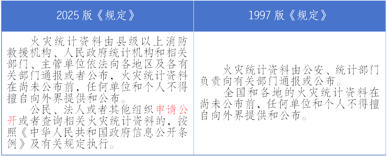 本条的主要变化是新增对于火灾统计资料可申请政府信息公开的规定。