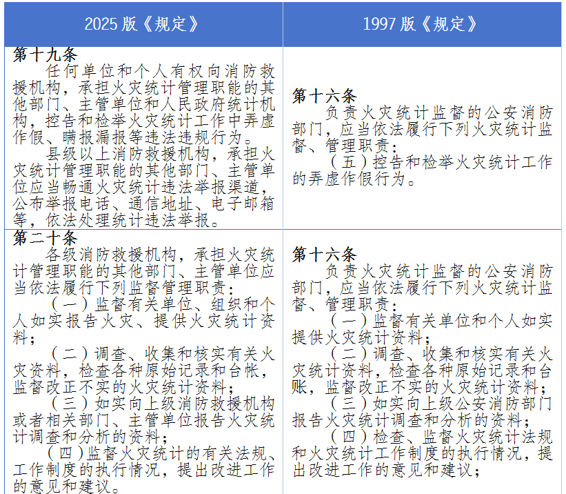 为切实贯彻《规定》第三条“真实、准确、完整、及时”的火灾统计工作基本任务内在要求,新规将监督、检举控告、处罚条款由两条细化为四条,并创设了主动通报、主动移送的联动措施;要求公布举报渠道(电话、邮箱等),匹配《信访工作条例》的公众参与机制;新规还大量借鉴了2024修订《统计法》第四十四条、四十五条、四十七条的监管举措。