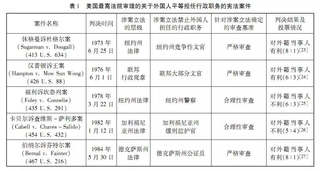 需要说明的是,除了非法移民子女的就学问题以外,美国最高法院审理的其他外国人平等保护案件均未曾采用中度审查基准。而合理性审查基准与严格审查基准在强度上相差悬殊。因此,嫌疑程度不同的差别对待(分类)在司法审查中也将受到法院的“差别对待”。那么,同样是禁止外国人担任行政职务的立法,它们是不是具有相同嫌疑程度的分类,因而得以接受相同强度的审查基准?美国最高法院通过五个案件给出了自己的答案。