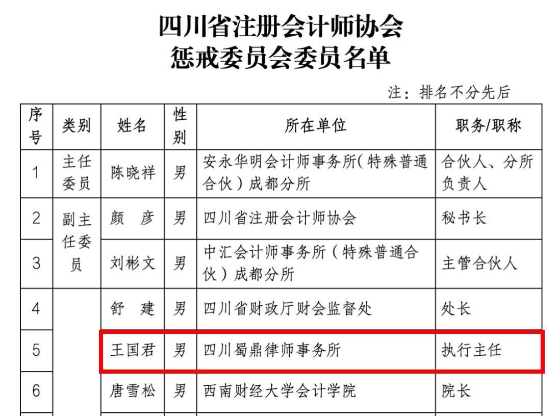 蜀鼎所执行主任、专家委员会主任王国君律师受邀担任四川省注册会计师协会第六届理事会惩戒委员会委员。该委员会主要工作职责为:审议秘书处对会员违规行为的检查报告或调查报告,作出拟惩戒决定;听取拟被惩戒当事人陈述和申辩;审议作出惩戒决定等。