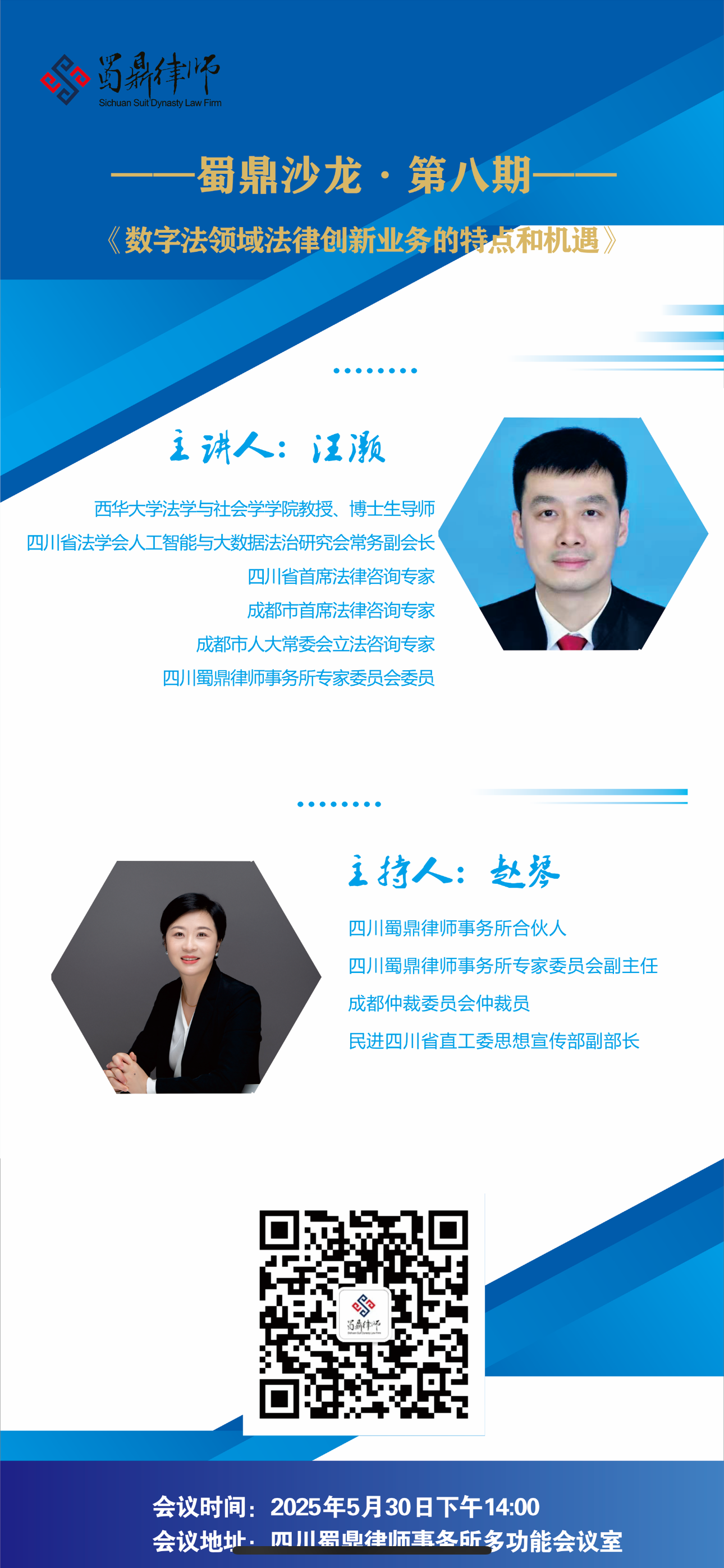 粽叶飘香的端午前夕,一月一期的蜀鼎沙龙如约举行。本期沙龙由蜀鼎所专家委员会副主任赵琴律师主持,主讲嘉宾为西华大学法学与社会学学院教授、博士生导师汪灏。作为四川省、成都市首席法律咨询专家,成都市人大常委会立法咨询专家,以及四川省法学会人工智能与大数据法治研究会常务副会长,汪灏教授结合自身的理论研究与实践调研成果,为大家带来了一场关于数字法领域法律创新业务特点与机遇的深度分享。