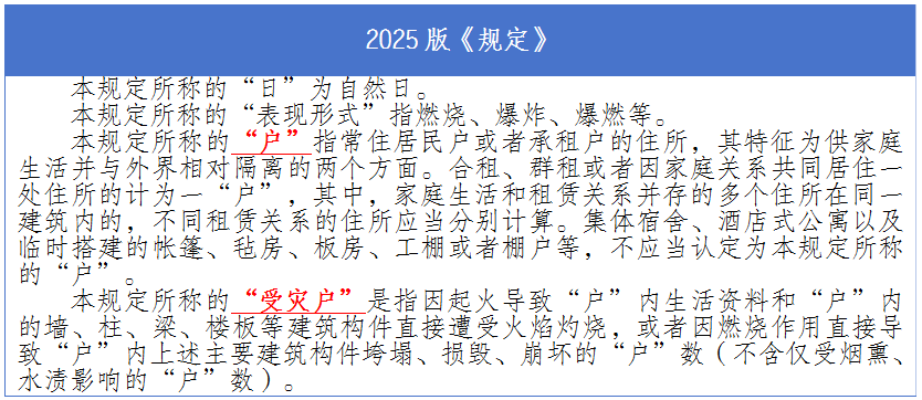 新规对“户”和“受灾户”作出明确定义,合租等情形下共计一户、多个住所在同一建筑内等情形下分户计算,对实务中长期存在的“户”的认定标准分歧明确了标准。