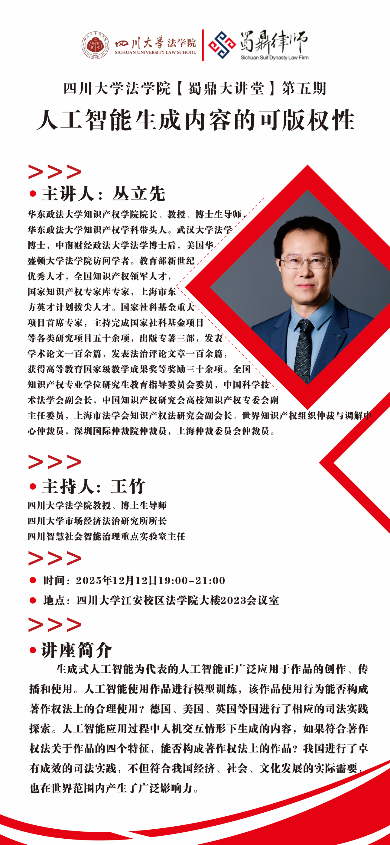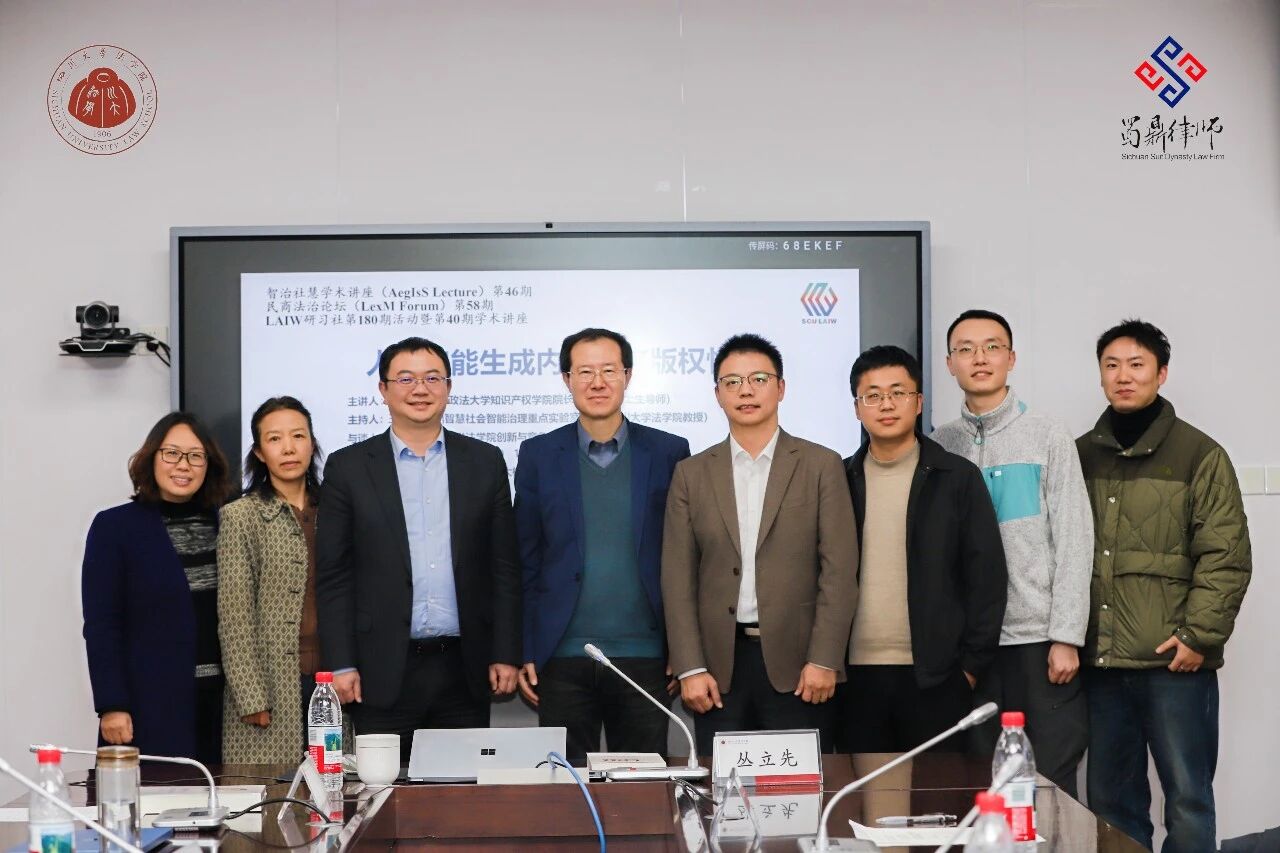 为精准把握人工智能技术在知识产权领域的法律前沿动态,搭建实务界与学术界的专业交流平台,2025年12月12日,由四川蜀鼎律师事务所协助支持的四川大学法学院法学名家“蜀鼎大讲堂”第五期,在四川大学法学院2023会议室成功举办。本次大讲堂特邀华东政法大学知识产权学院院长、博士生导师丛立先教授担任主讲嘉宾,以“人工智能生成内容的可版权性”为核心展开深度分享,四川蜀鼎律师事务所专家律师、四川大学法学院博士生导师王竹教授受邀主持,蜀鼎所部分律师、川大法学院师生共同参与本次活动。